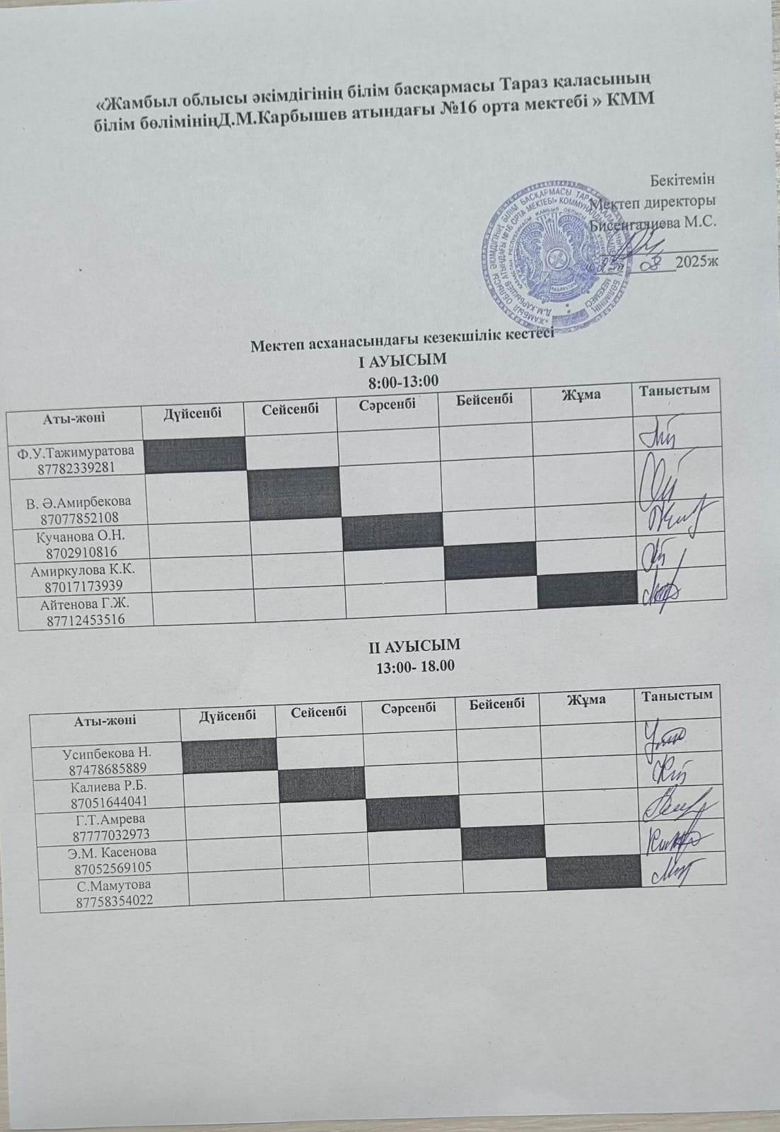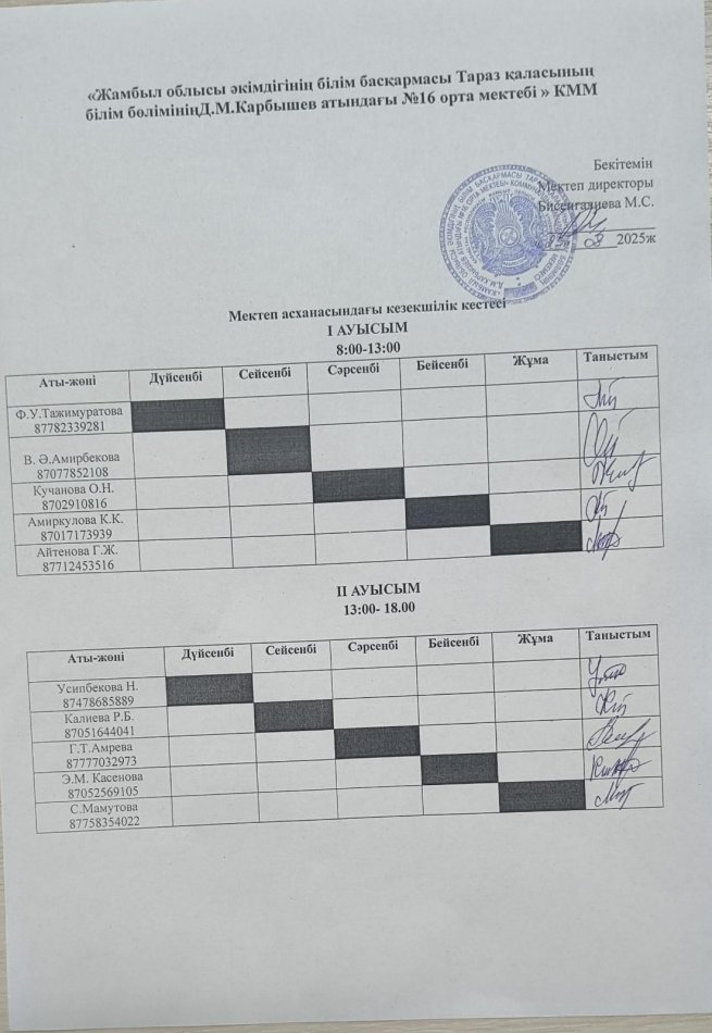 Мектеп асханасында мұғалімдердің кезекшілік кестесі » СШ №16