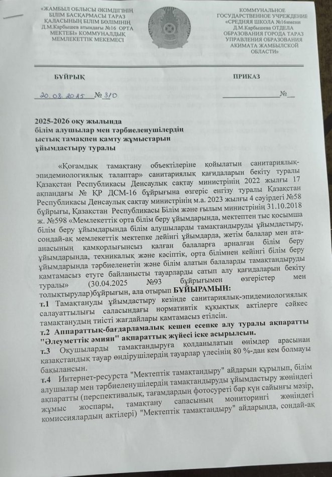 20 тамыз 2025 0 1 2 3 4 5 2025-2026 оқу жылында білім алушылар мен тәрбиеленушілердің ыстық тамақпен қамту жұмыстарын ұйымдастыру туралы