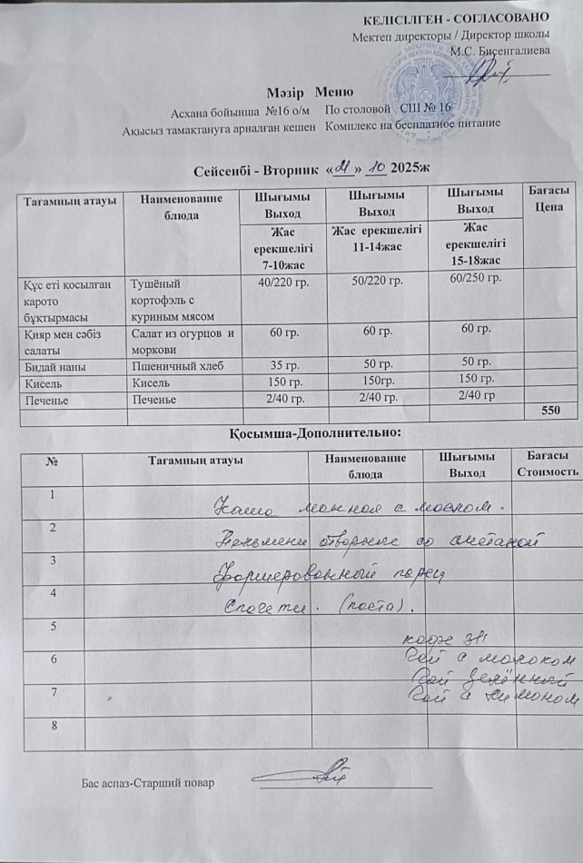 Күндік ас мәзірі » СШ №16